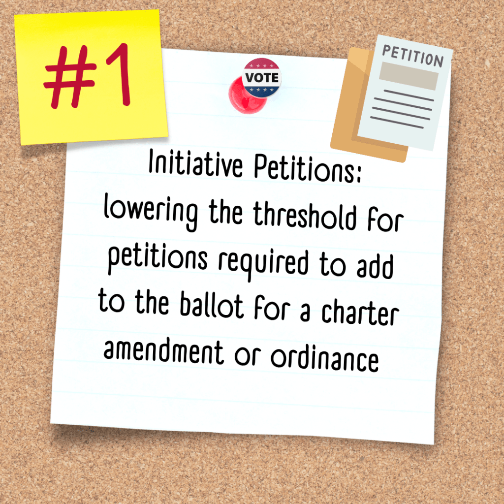 - Purpose: Amendment lowers petition requirements for charter amendment from 10% of registered voters from each district to 7%; for ordinances from 7% per district to 3% per district; removing signature withdrawal procedures; revising several other requirements ($7,000 savings)
