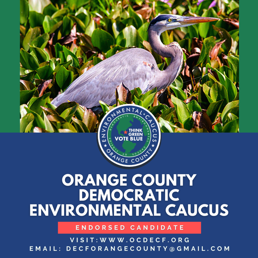 Electing environmental champions is crucial for ensuring that our policies and practices prioritize the health of our planet and the well-being of future generations. The Orange County Democratic Environmental Caucus is dedicated to this mission by making local endorsements for county-specific races, holding candidates accountable to high environmental standards.