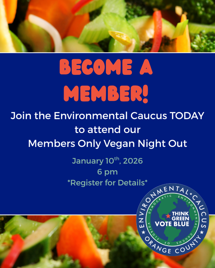 Join the members of the Orange County Democratic Environmental Caucus for a Vegan Night Out! Become a member today, and on January 10th, 2026, socialize, network, and eat delicious food with the Environmental Caucus. Once you become a member, register for the event below!