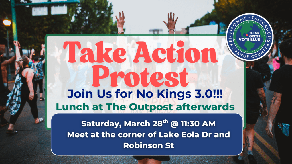 Want to join a protest with a group? Attend the Orange County Democratic Environmental Caucus at the No Kings Protest on March 28th! In lieu of our monthly Take Action Potluck, we are transitioning this month’s event to a Take Action Protest! We will meet as a group on the corner of Robinson St and Eola Dr at 11:30 am, and then we will walk over to the protest as a group. We will be getting lunch at The Outpost after the protest. We hope to see you there! Register below.