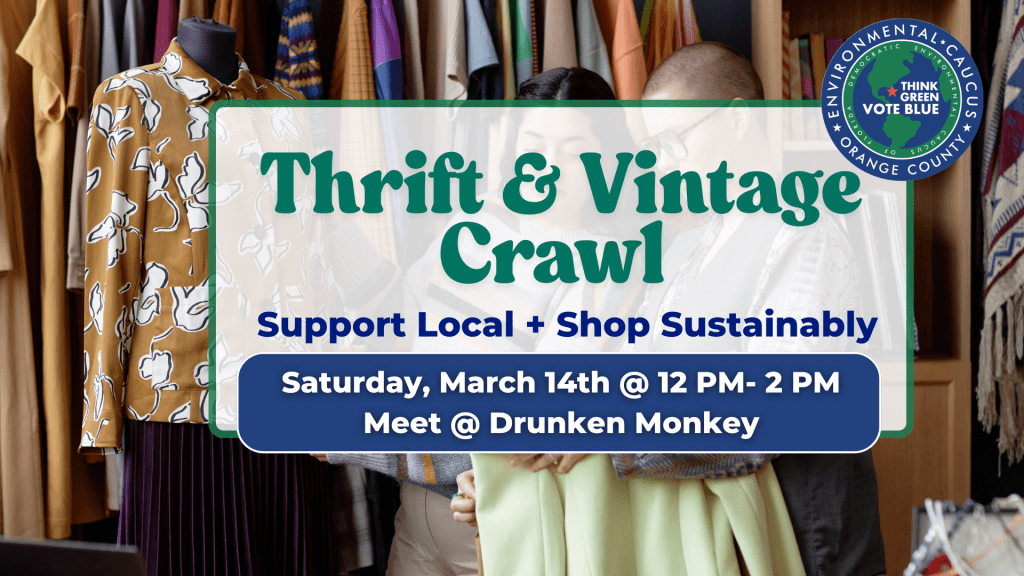 Join the Orange County Democratic Environmental Caucus for our inaugural Thrift & Vintage Crawl! We will be supporting local thrift and vintage stores in the Milk District. Meet at Drunken Monkey at 12 pm to carpool. Shopping sustainably is the BEST way to shop, so let’s support our community and our environment! Register below.